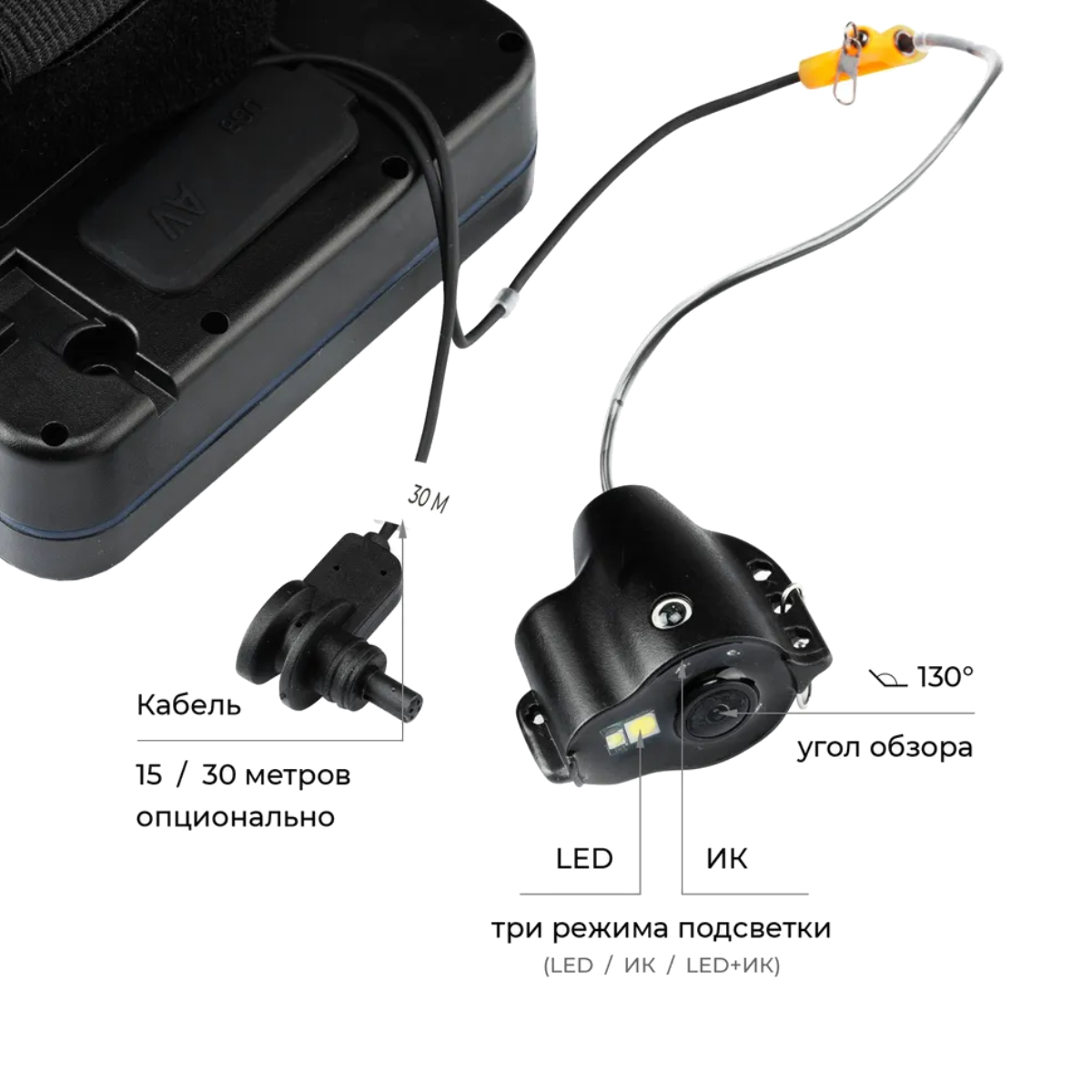 Камера также поддерживает фото- и видеосъемку, что позволяет запечатлеть интересные моменты под водой. Широкий угол обзора в 130 градусов и усиленная подсветка с 2 белыми и 4 инфракрасными светодиодами обеспечивают видимость даже при низкой прозрачности воды. В комплект входят камера, монитор, сумка, SD-карта на 8 Гб и крепления.