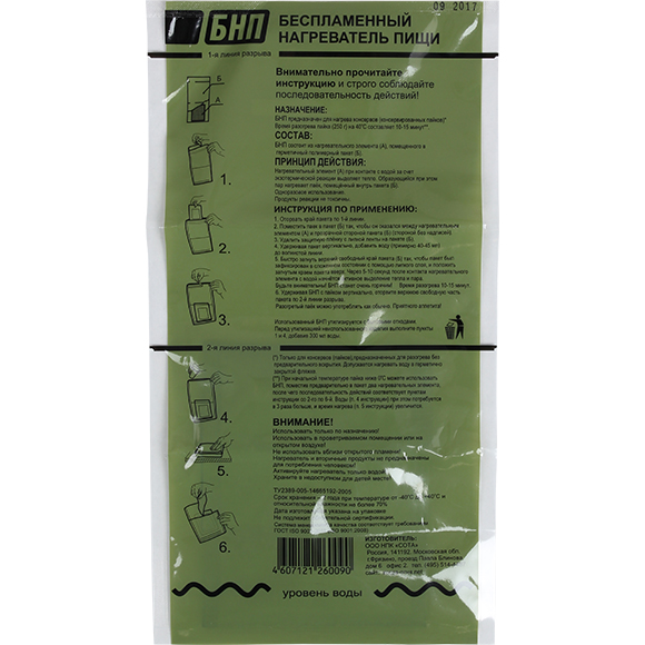 6. Использованный нагревательный элемент вынуть из пакета и утилизировать с бытовыми отходами. Остаток воды, после подогрева, не использовать для питья.