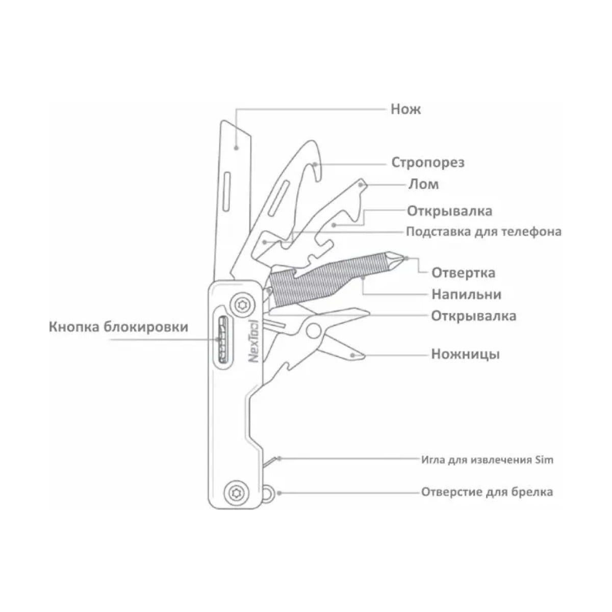 Модель включает 10 инструментов: нож, консервный нож, стропорез, ножницы, напильник, держатель для телефона, ключ для извлечения SIM-карты, открывалку, крестовую и шлицевую отвёртки. Все элементы легко раскрываются и фиксируются.