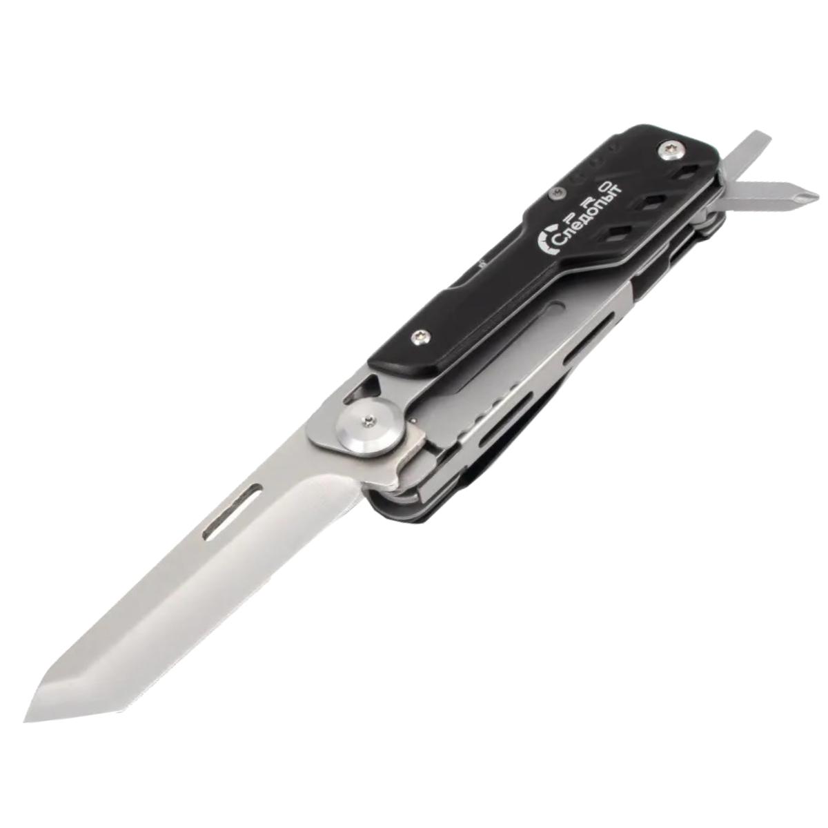 Мультитул оснащен зажимом для крепления на ремне и поставляется с мягким чехлом.