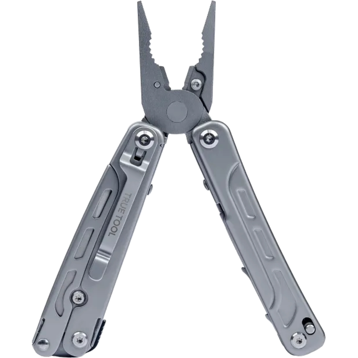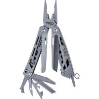 Модель включает подпружиненные плоскогубцы, нож длиной 7,5 см, серрейторное лезвие, пилу по дереву, огниво, пробойник по коже, резак по картону, напильник, линейку до 10 см и крепёжное кольцо. Каждая функция рассчитана на надёжную работу в полевых и бытовых условиях.
