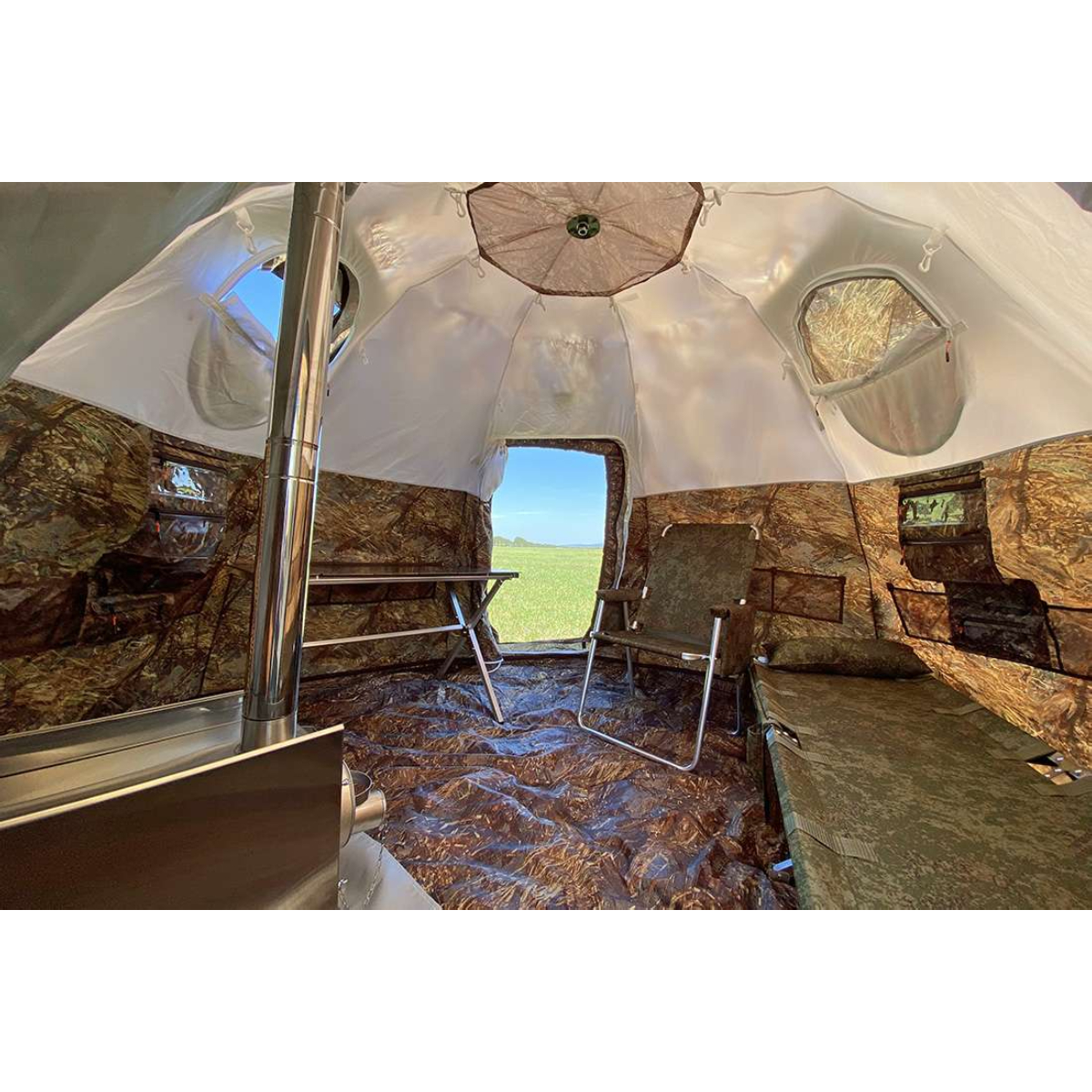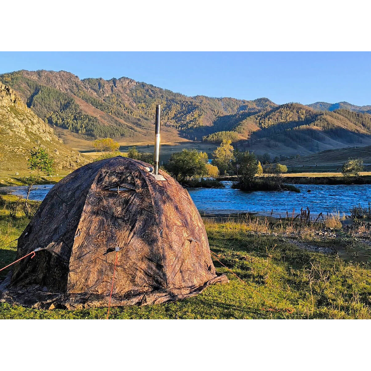 Внешний тент выполнен из водонепроницаемой ткани Оксфорд 300 PU 4000, а внутренний — из Оксфорд 210 PU 2000. Между тентами создается воздушная прослойка, которая уменьшает конденсат и улучшает сохранение тепла. Окна палатки оснащены многослойной защитой: морозостойкая TPU-пленка, антимоскитная сетка и клапаны на молнии.