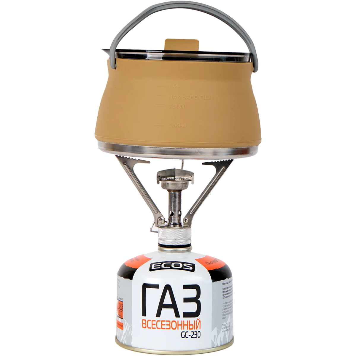 Силиконовый чайник с металлическим дном весит всего 260 г и занимает минимум места. Он выполнен из экологичного и безопасного для пищевых продуктов жаропрочного силикона.
