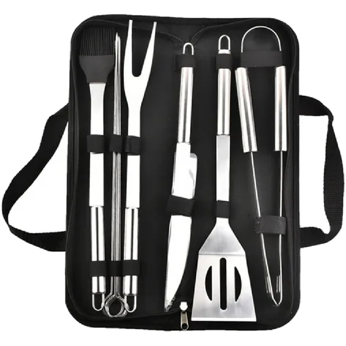 В комплект входят: вилка для мяса, удобные щипцы, универсальный нож, кулинарная силиконовая кисточка, металлическая лопатка и 4 шампура, все хранится в компактном кейсе на молнии.