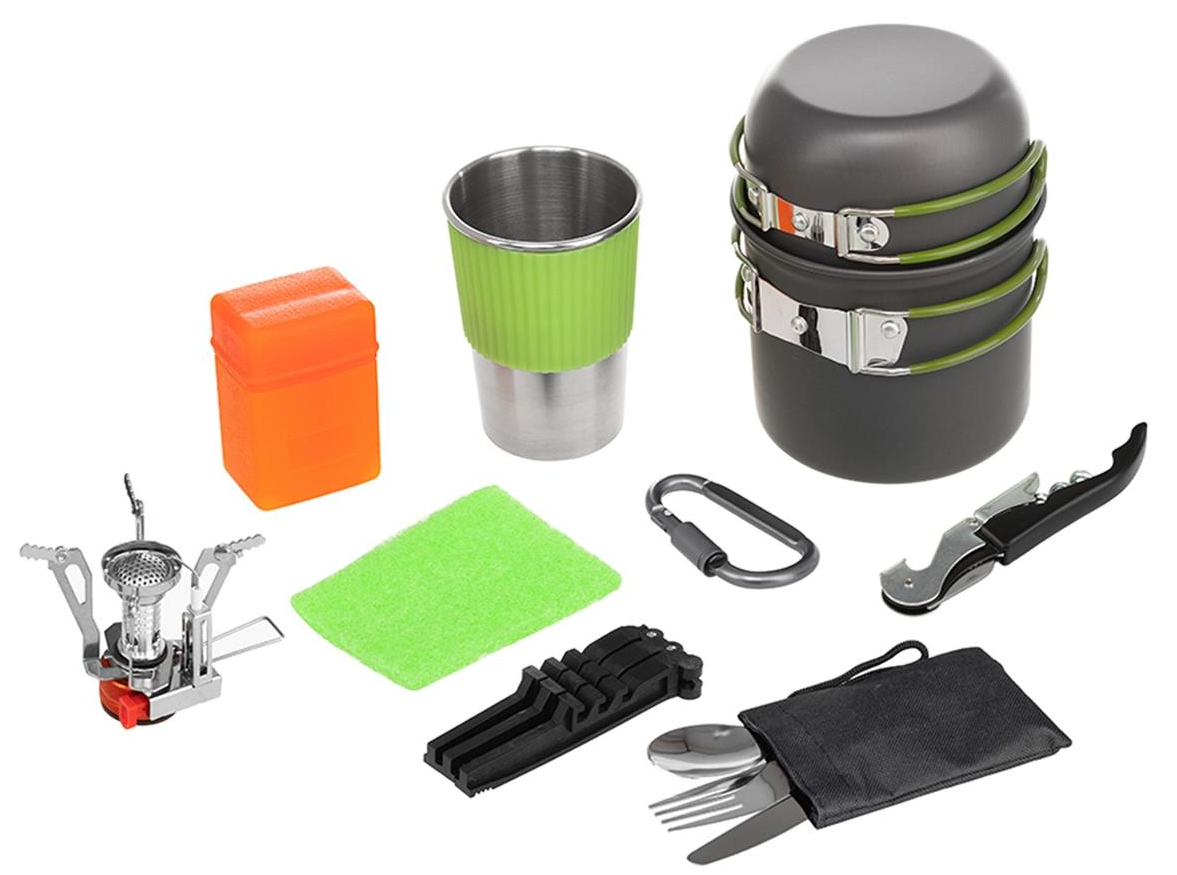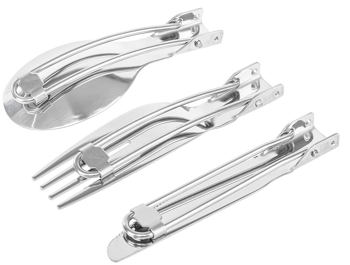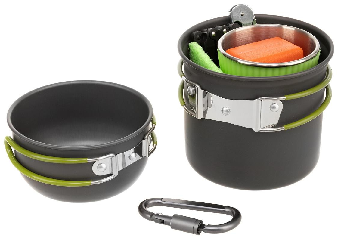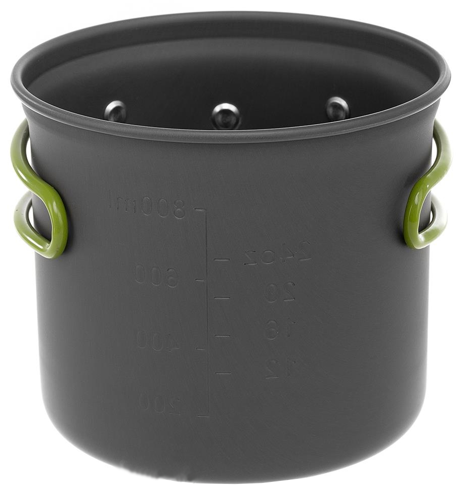 Посуда имеет откидные ручки с термоизолирующим покрытием, которые экономят объем при транспортировке, делая использование посуды более комфортным. Набор поставляется с нейлоновым мешочком для транспортировки и хранения. Вес набора 750 гр.