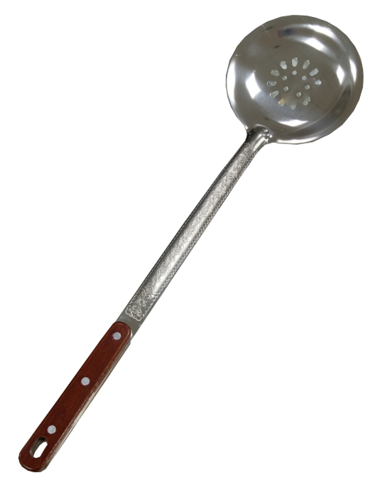 Узбекская шумовка среднего размера — это традиционный кухонный инструмент, идеально подходящий для перемешивания и процеживания блюд.