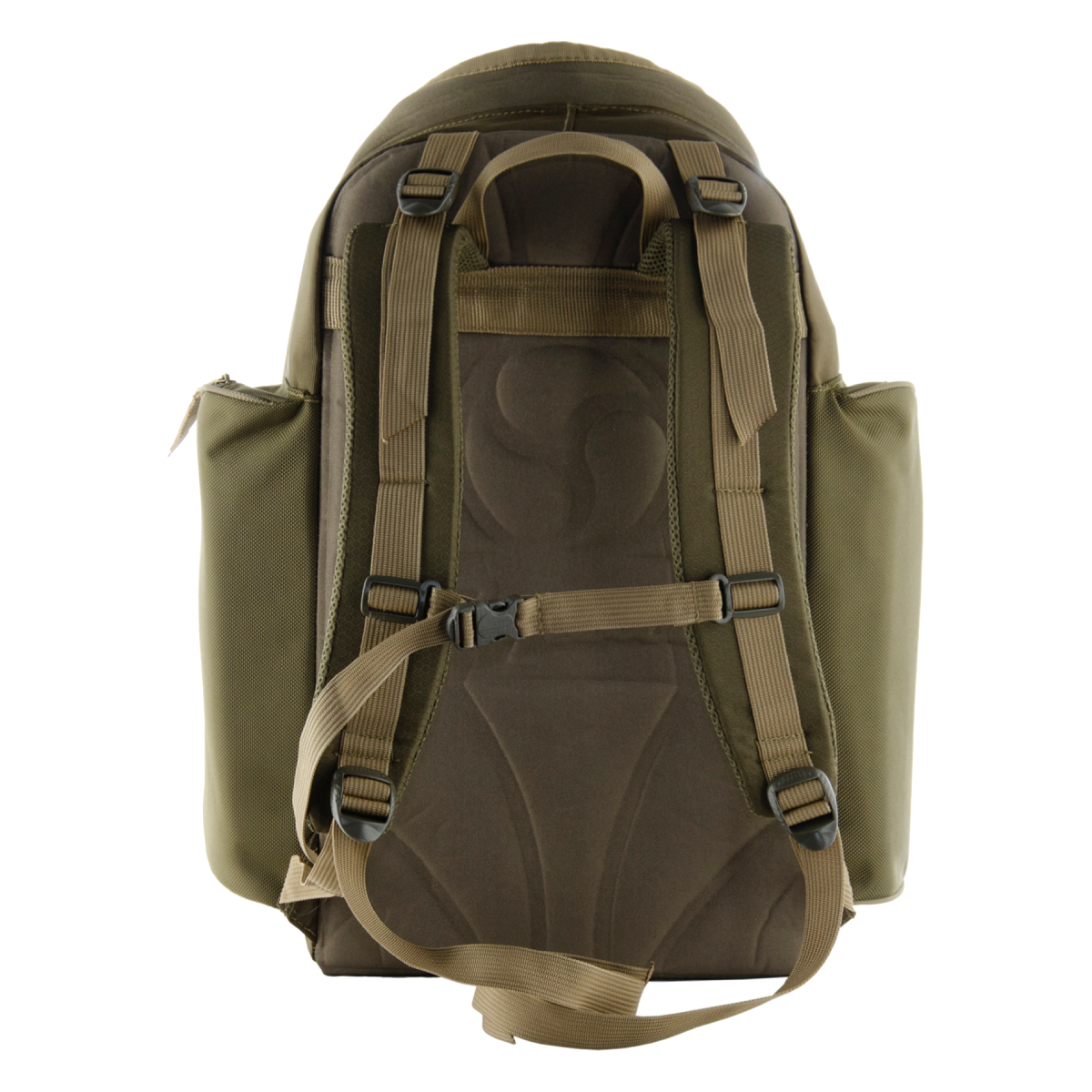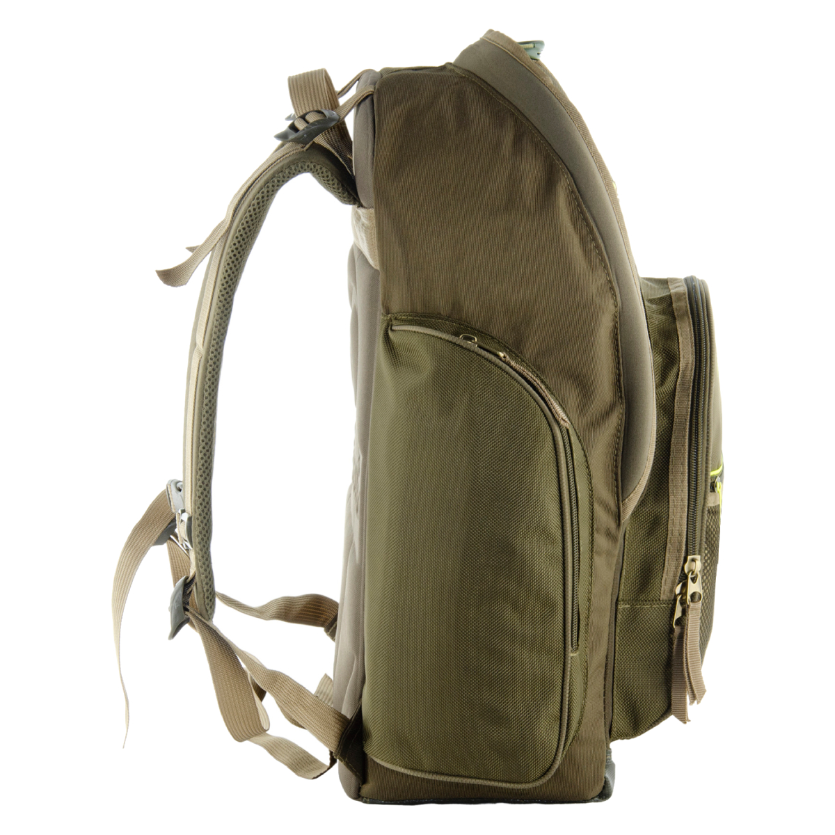 Защита входа в главное отделение выполнена из неопреновой ленты, предотвращающей попадание влаги. Рюкзак оборудован стандартной подвесной системой с регулировкой по груди и уплотнённой спинкой, что обеспечивает комфорт.