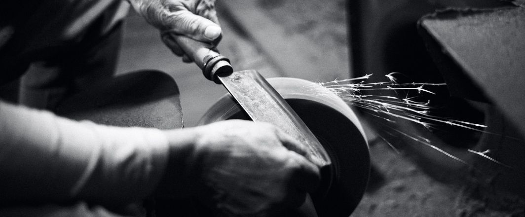 В мастерской ТД "ИОЛЛА" используют клон системы Apex, но усовершенствованный и усиленный под большой поток разных ножей. Китайские бруски выработали себя после пятидесятого ножа, и были заменены отечественными, алмазными абразивами Веневского завода. Почему алмазные бруски? Алмаз — самый твердый материал в мире. Брусками с алмазным напылением можно выточить клинок из любой стали с любой твердостью. А так же алмазами ножи точатся намного быстрее и агрессивнее. Алмазные бруски долговечнее, чем другие абразивы. Брусками с крупной зернистостью выводим и формируем режущую кромку, до появления четкого зусенца, а более мелкими убираю его. Окончательную доводку остроты производим на небольшом гриндере с полировочной лентой. После чего волосы на руке отскакивают с хрустом.